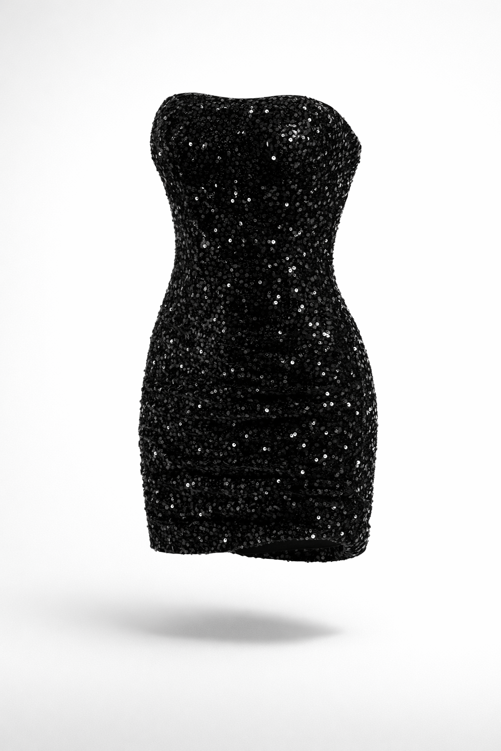 Smyslné černé minišaty bez ramínek, celé pokryté jemnými flitry, které krásně chytají světlo. Přiléhavý střih zvýrazňuje křivky a působí elegantně, sebevědomě a sexy zároveň. Minimalistický design bez ramínek nechává vyniknout postavu a dodává šatům čistý, provokativní look.