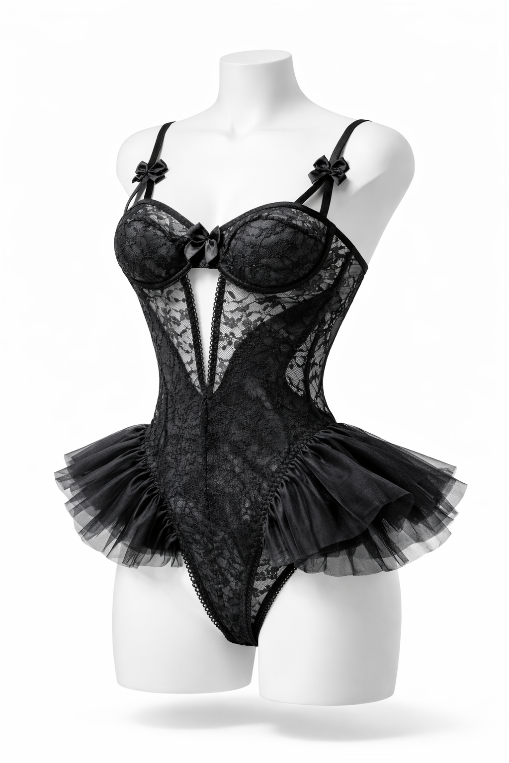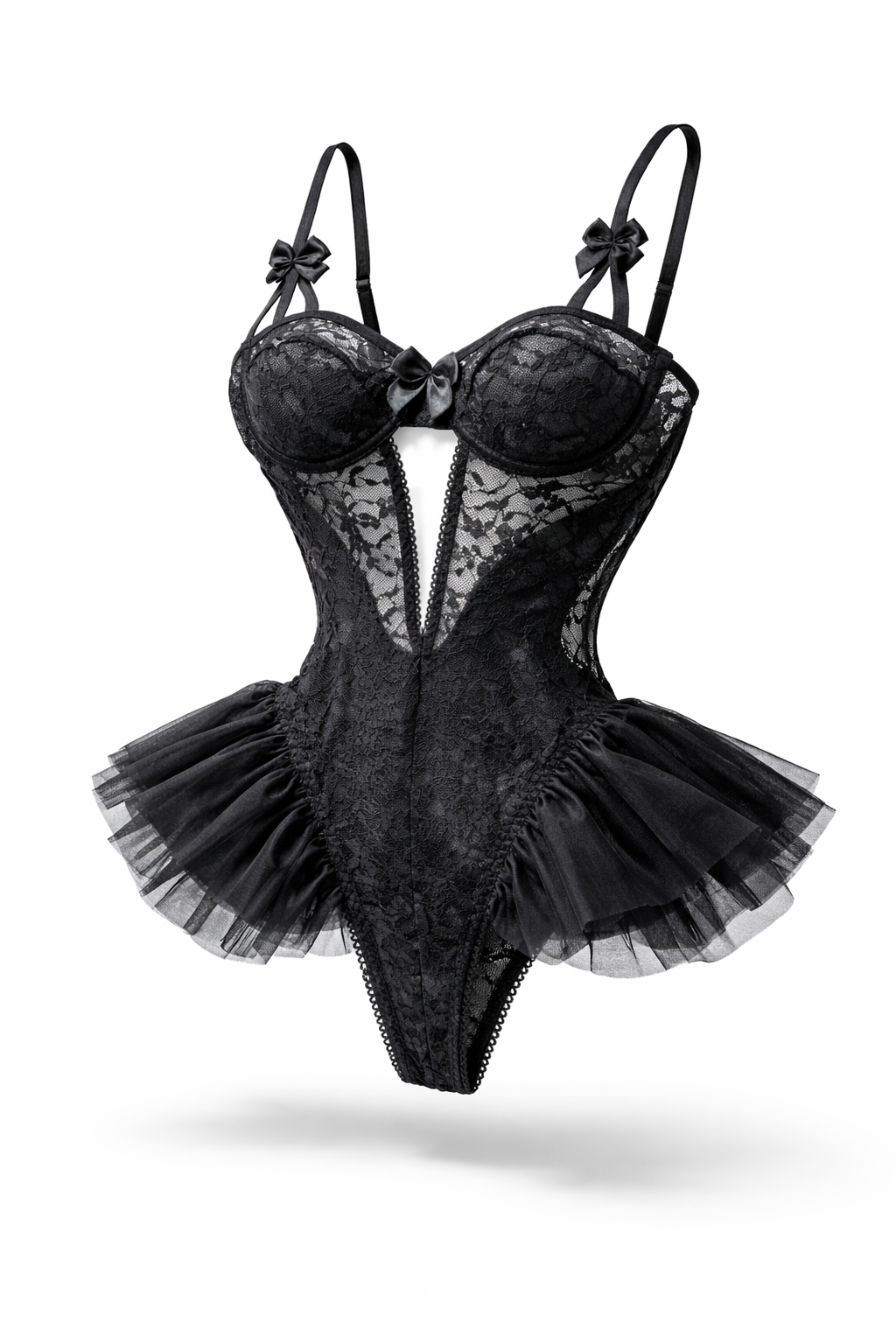 Elegantní a svůdné černé body z jemné krajky, které kombinuje ženskou rafinovanost s hravou provokací. Průsvitná krajka zvýrazňuje křivky a vytváří smyslnou siluetu, zatímco lehká tylová sukně dodává modelu dramatický a výjimečný efekt.