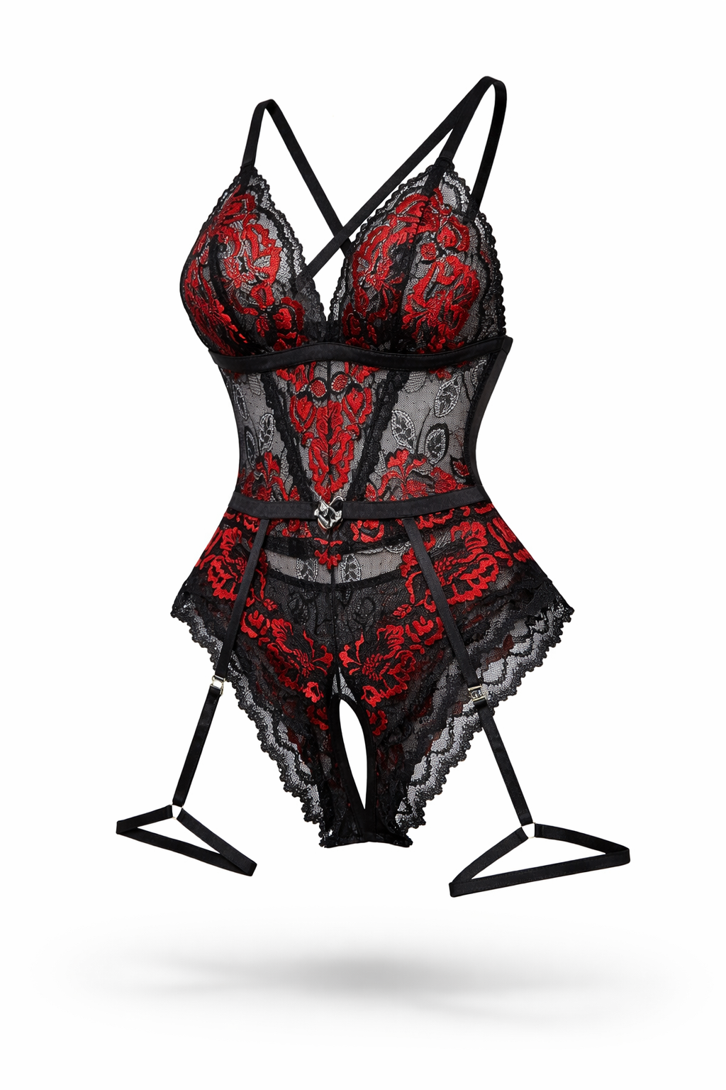 Smyslné krajkové body v kombinaci hluboké černé a vášnivé červené barvy, které okamžitě přitáhne pozornost. Průsvitná krajka elegantně obepíná tělo, zvýrazňuje křivky a vytváří ženskou, svůdnou siluetu.