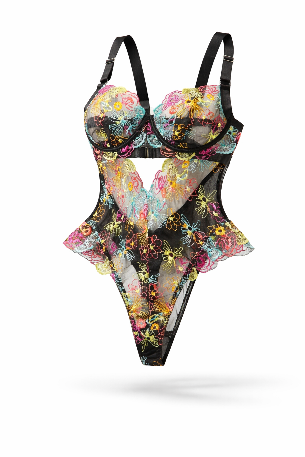 Smyslné body z jemné průsvitné síťoviny, zdobené bohatou květinovou výšivkou v živých barvách. Elegantní střih zvýrazňuje křivky, opticky tvaruje pas a působí luxusním, ženským dojmem.