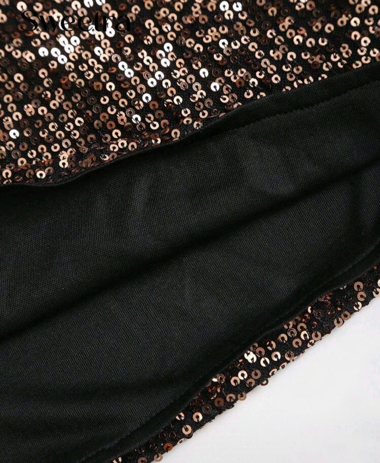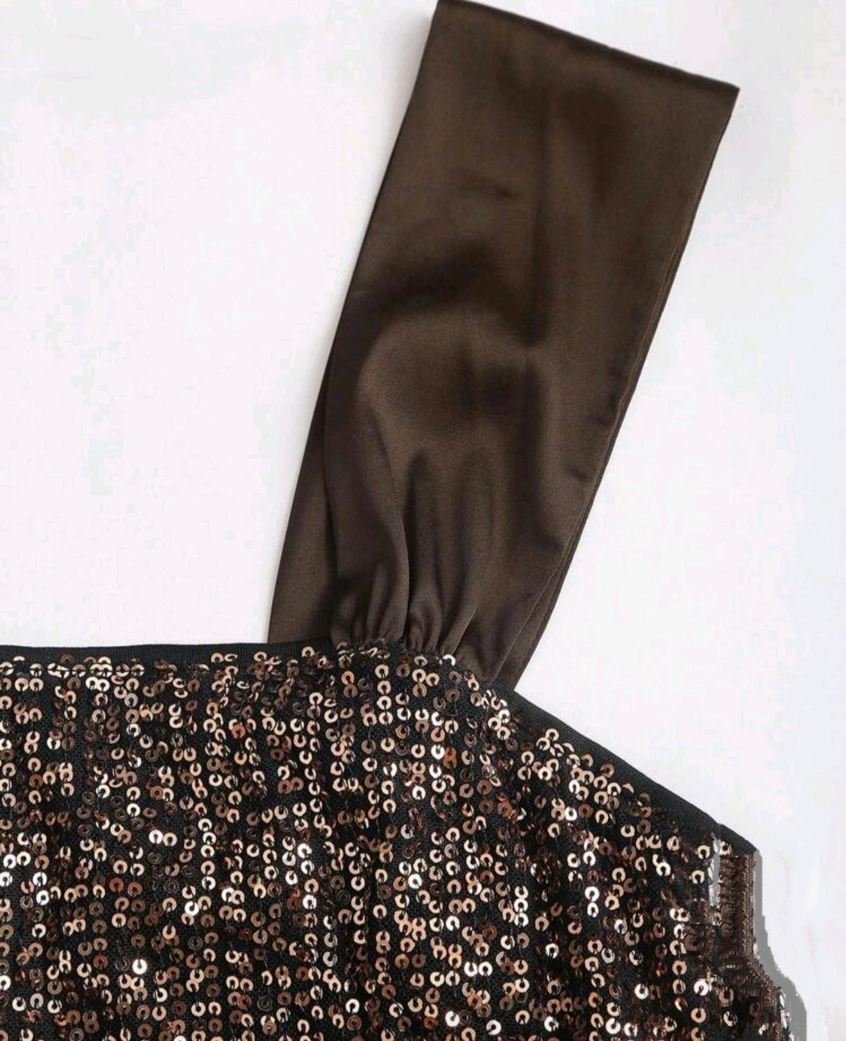 Třpytivé mini šaty v hlubokém čokoládovém odstínu, které okamžitě přitáhnou pohledy. Celý povrch je zdobený jemnými lesklými kamínky, které vytvářejí luxusní shimmer efekt při každém pohybu.