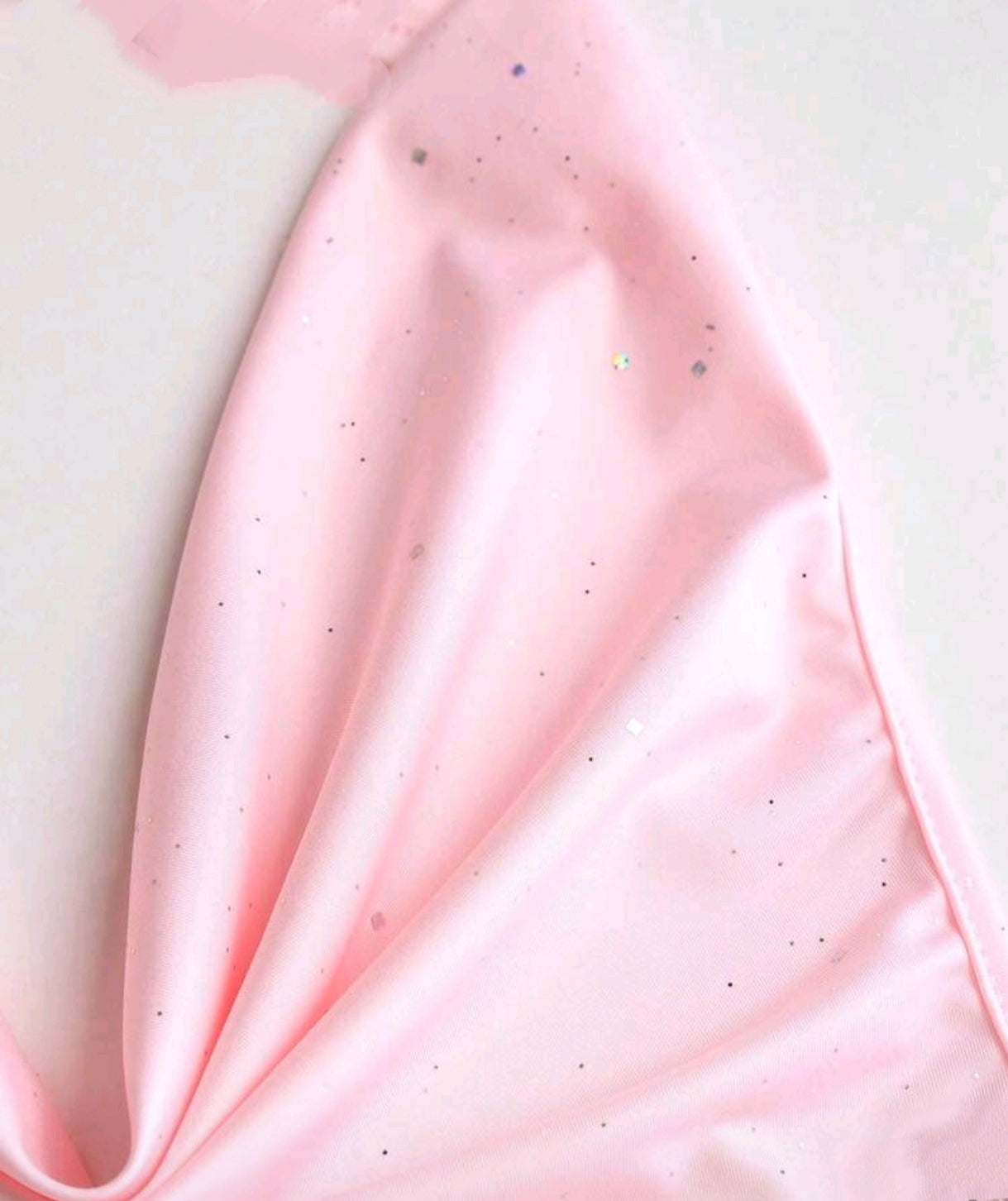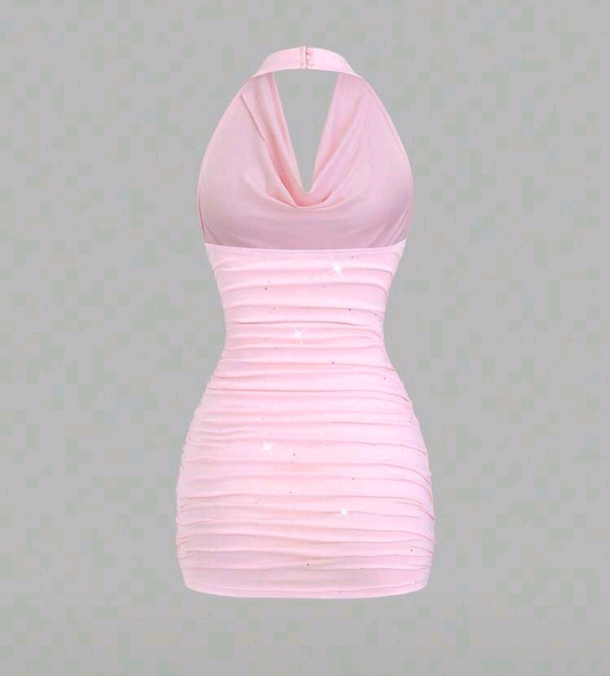 Pastelově růžové mini šaty s halter výstřihem a jemným řasením po celé délce, které krásně tvaruje postavu. Měkký splývavý materiál zvýrazní siluetu a drobné třpytivé detaily dodávají šatům jemný glow efekt při světle.