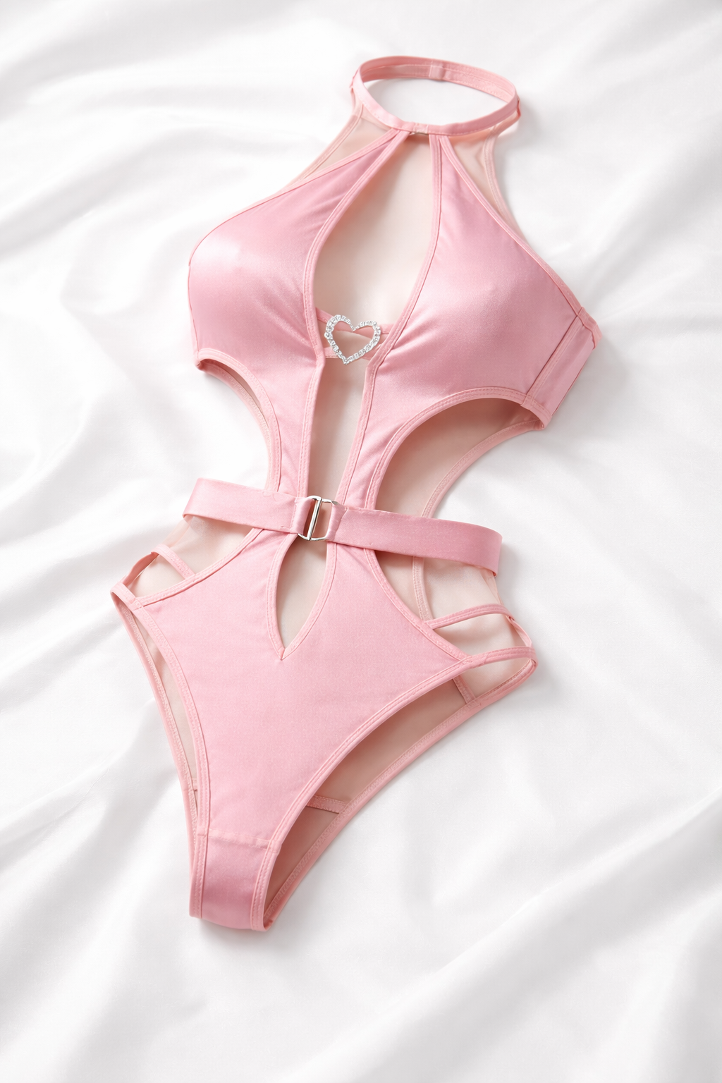 Růžové saténové body s výřezy a srdíčkovým detailem