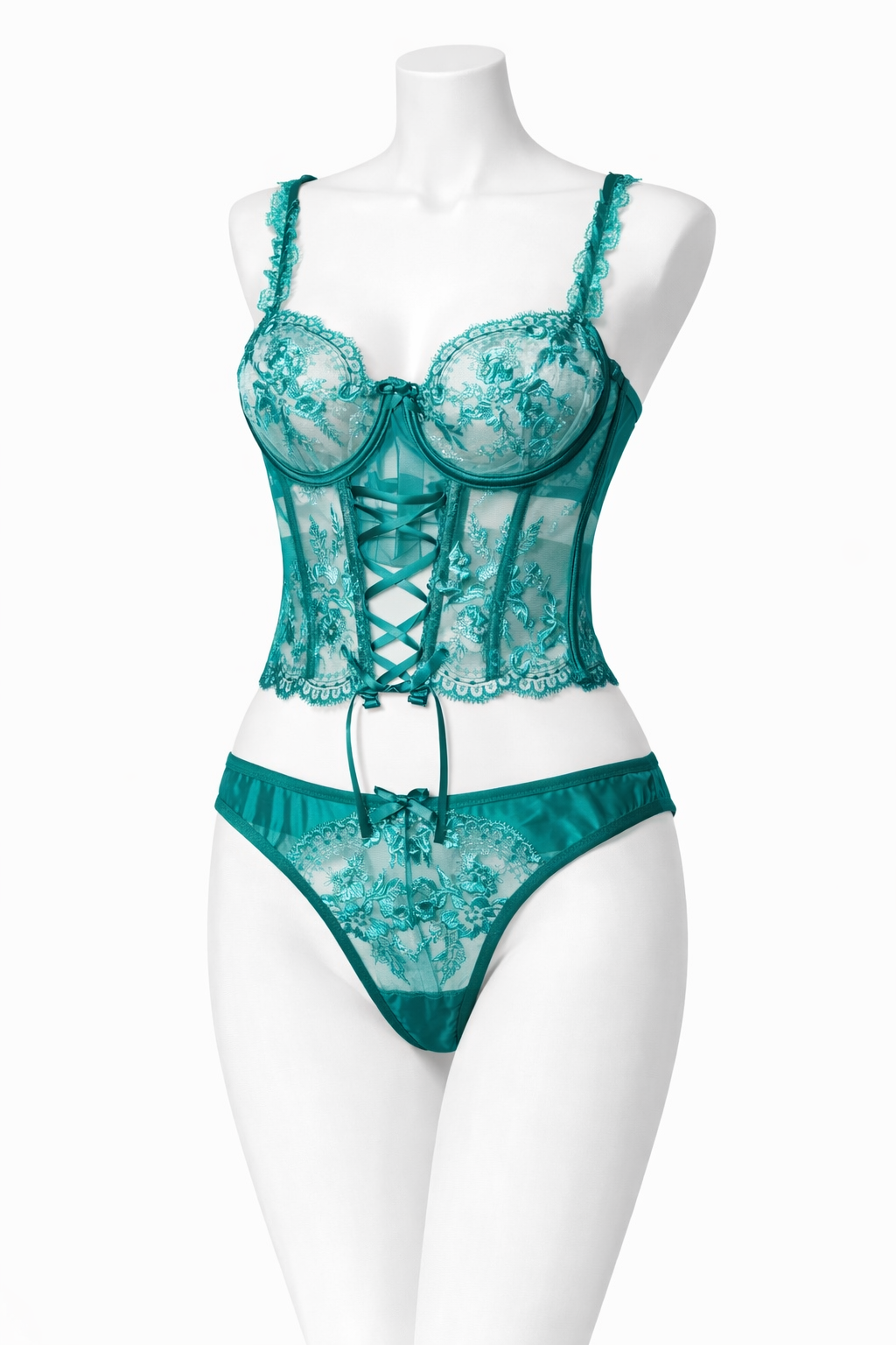 Elegantní a výrazný set v hlubokém smaragdovém odstínu, který kombinuje jemnou krajku s propracovaným vyšíváním a korzetovým střihem. Smyslný design krásně tvaruje siluetu, zvýrazňuje pas a působí luxusně na první pohled.
